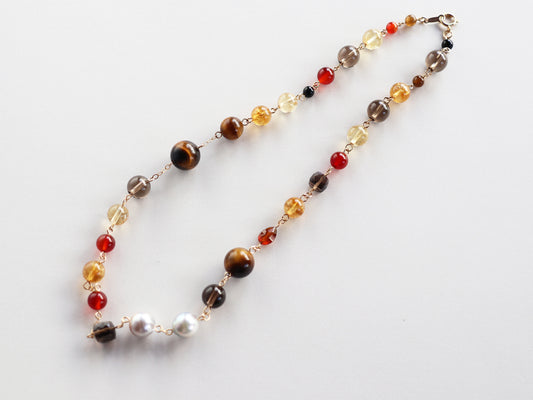 スモーキー、カーネリアン、タイガーアイ、シトリン、淡水パール、秋色14KGFネックレス