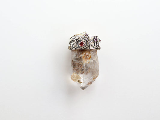 ガネーシュヒマール産ヒマラヤ水晶原石 スモーキー マウンテンシャドー ガーネット付きシルバーペンダントPN:HCS-8