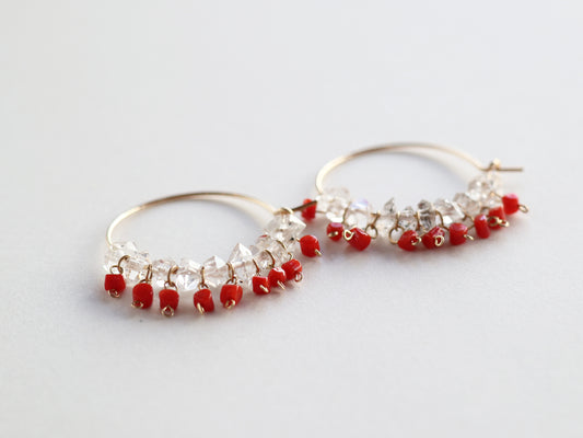 ◆ItoMe Stone◆14KGFフープピアス イタリア産珊瑚、ハーキマーダイヤモンドPN:IPS-238
