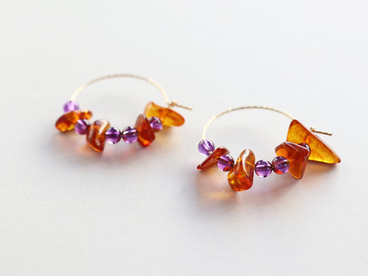 ◆ItoMe Stone◆ピアス*琥珀、アメジストのグリッターフープ